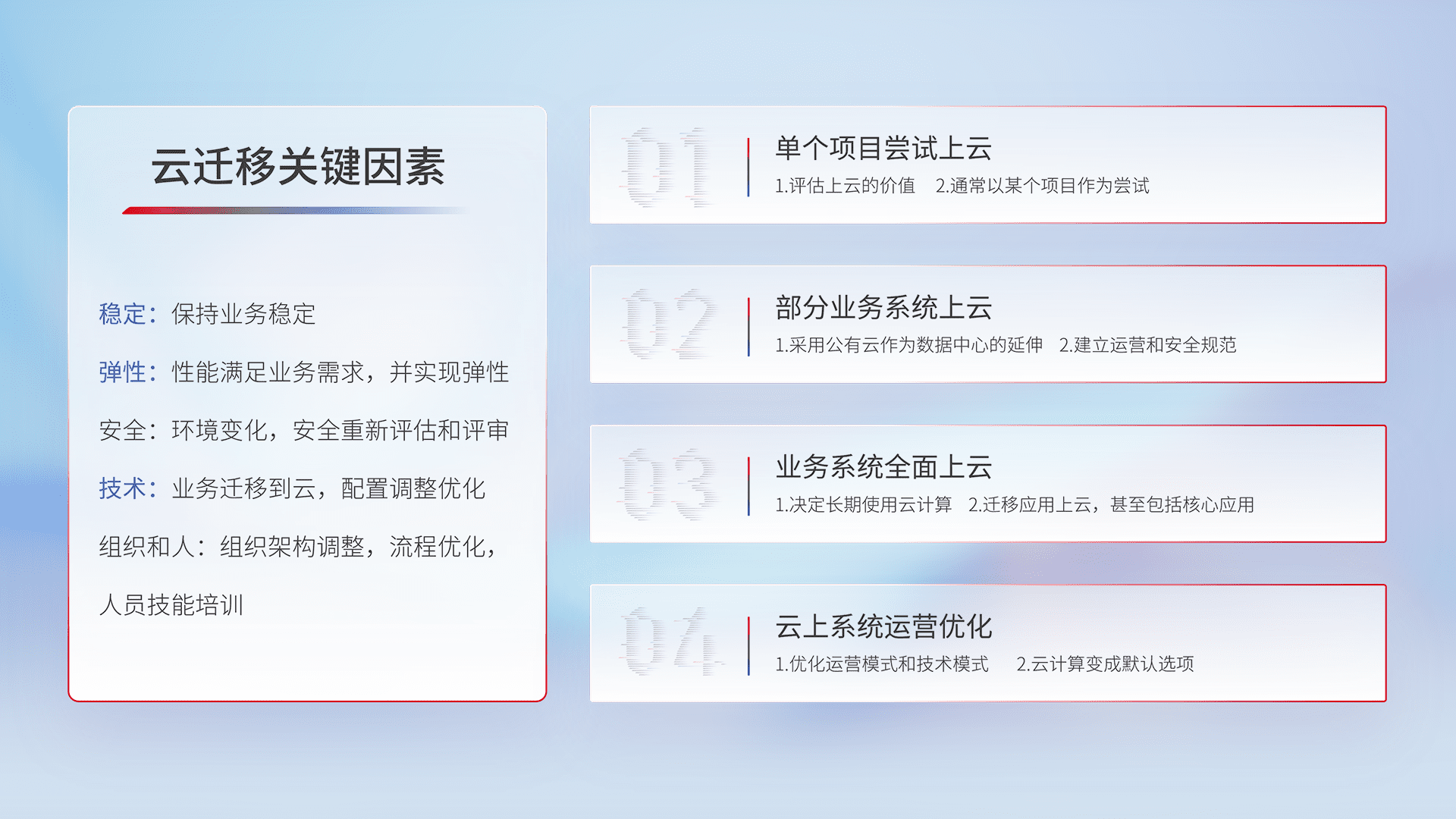 结合实际业务,,,,从规划设计、、云平台选型、、、、云原生改造、、数据迁移、、、集成交付,,,,迁移全过程为客户识别最佳上云路径,,做好风险识别管理,,,设计网络架构、、身份权限、、、、安全审计合规、、、操作审计、、日志审计、、监控告警策略、、多站点容灾设计等,,对云上基础设施进行整体规划,,,,提升IT治理水平,,,以满足弹性、、、高可用、、高性能的需求。。