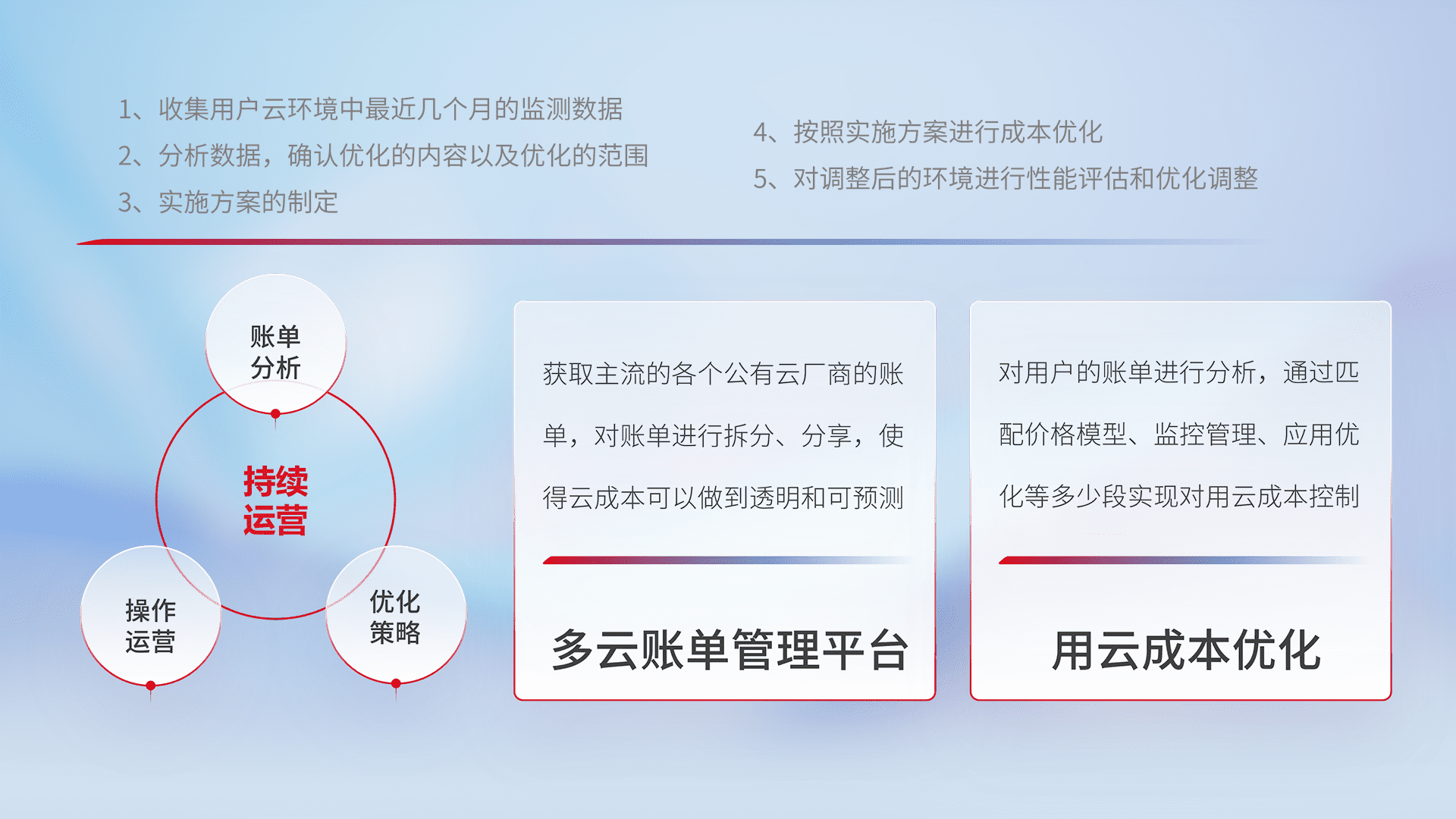 通过多云纳管,,以统一的资源数据模型把客户的云资源进行抽象和封装,,进而实现对多云资源的统一操作,,保障云资源管理的可靠性、、、稳定性与可用性。。量身定制化运维内容,,,配置、、、、开发运维、、补丁管理、、备份、、监控、、、、认证和访问管理、、审计和日常巡检等,,保障在用云过程中的可靠度,,稳定度以及高可用率。。。